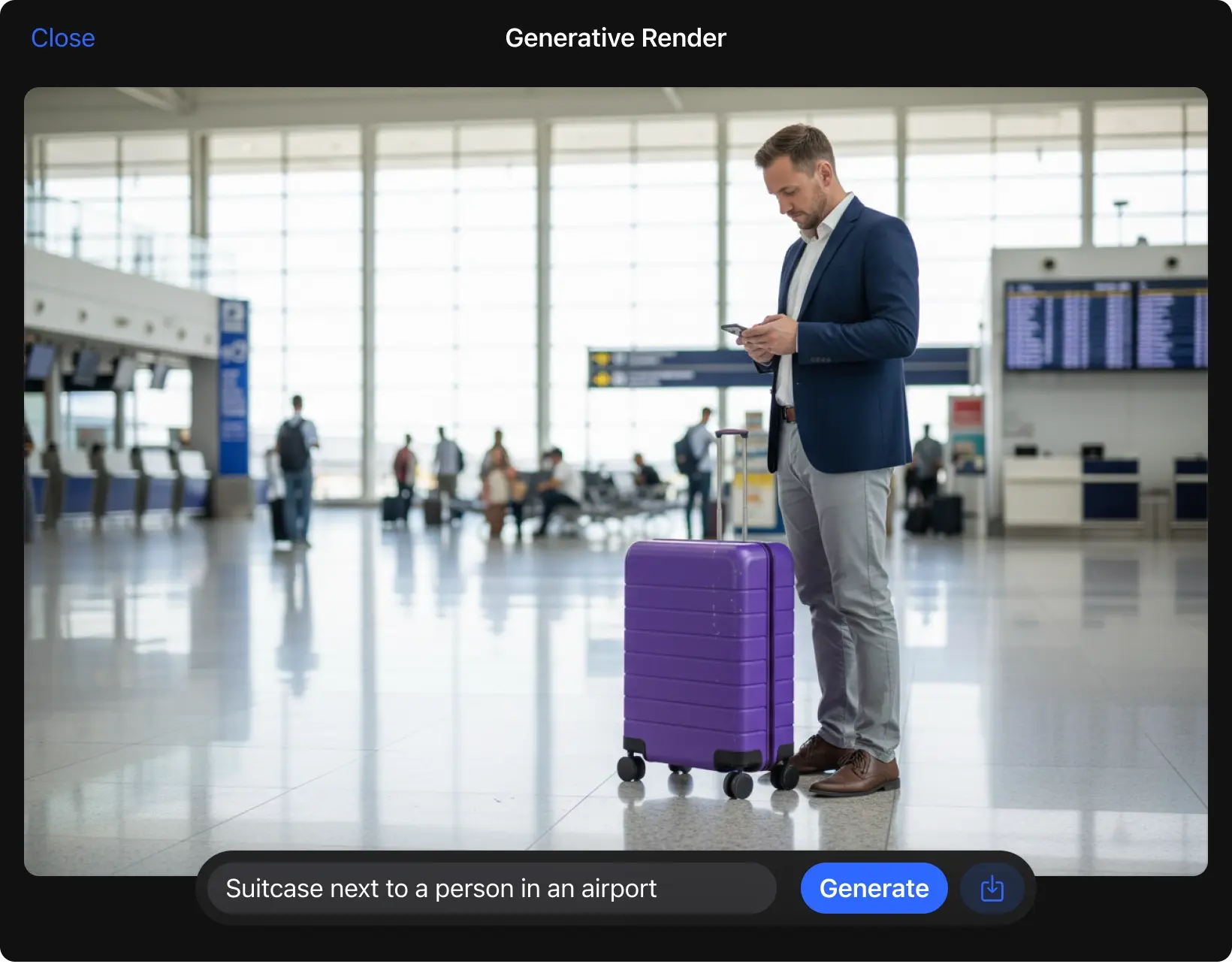 Seconds later, your model is rendered in a polished, true-to-scale scene you can save or share immediately.