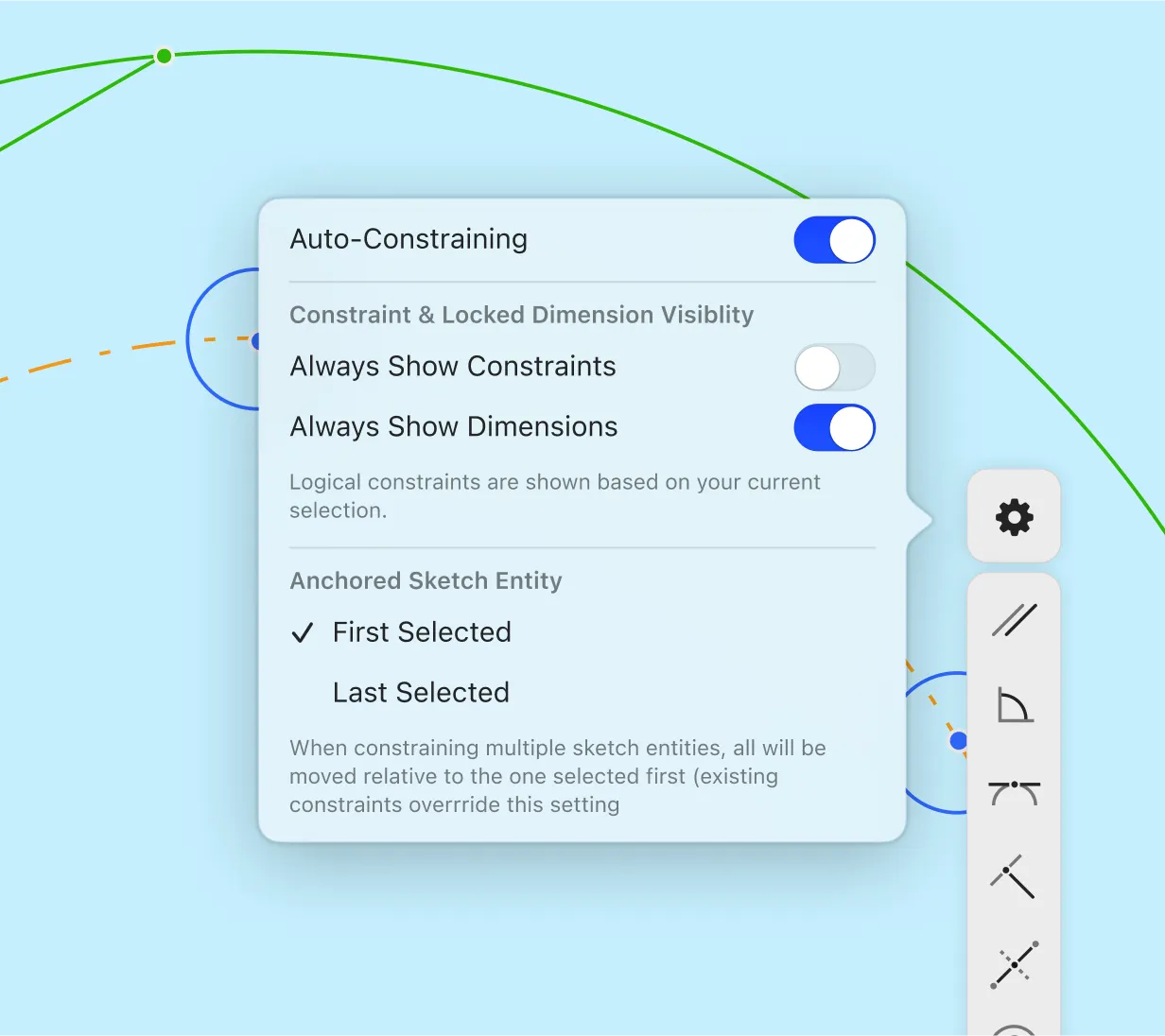 Shapr3D’s adaptive UI highlights only valid constraints for a selected sketch element, making it easier to see which rules you can apply.