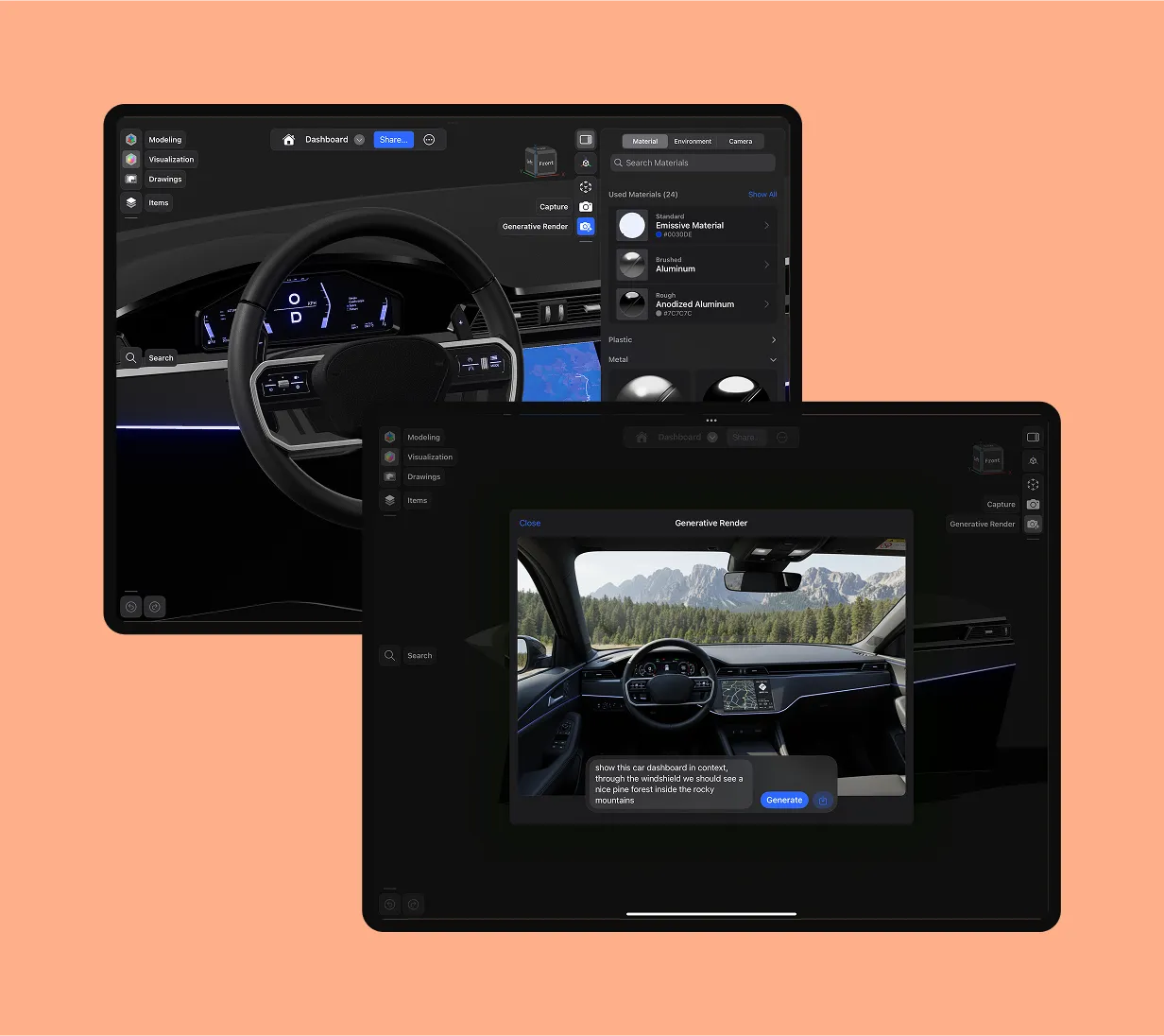 Our Generative Render feature uses AI to place your model in a photorealistic scene in seconds. By combining your geometric data with text prompts and environment presets, AI fills in realistic textures, lighting, and backgrounds, allowing you to skip the manual setup usually required for high-end rendering.